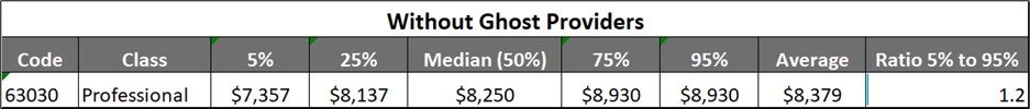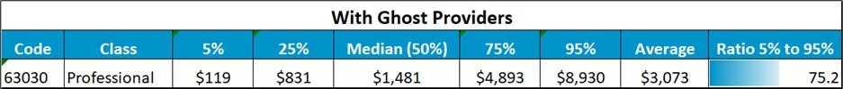 Interestingly, removing ghosts doesn’t typically drop variability that much, as for 63047 (laminectomy), even without ghosts we find a much wider range-