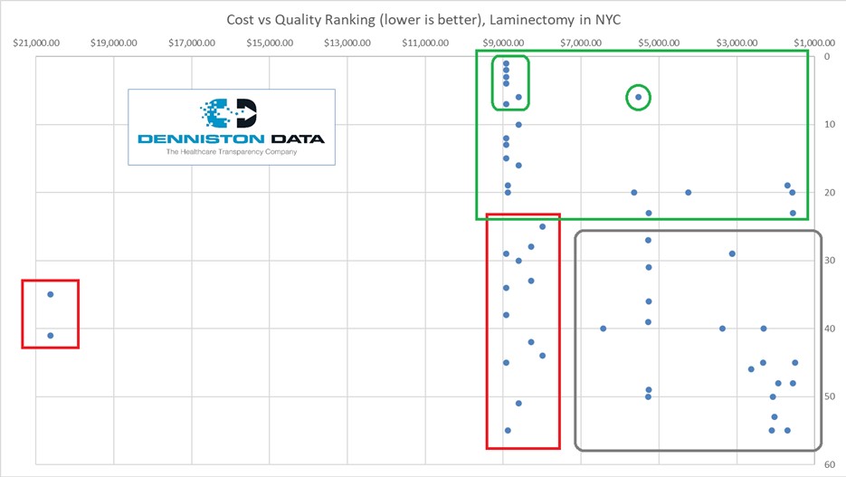 Nearly all the “best” – top 10 – providers and practices in the UHC network charge about $9k for the laminectomy, but one stands out at considerably less, about $5,500. If we widen to the top 20 providers and practices, we find options at much lower prices, still among higher ranked providers.